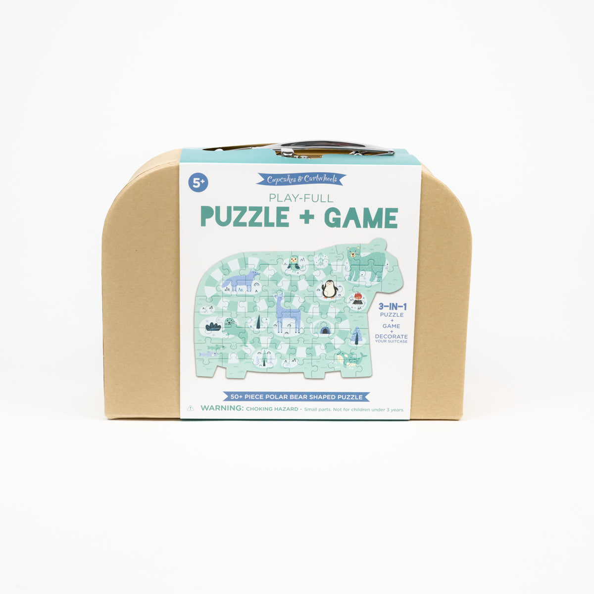 3-in-1 Polar Bear Shape Puzzle/Game Board packaged in a suitcase storage box. Includes: 50+ Puzzle Pieces, 2 Game Board Pieces, 1 Dice, and Instruction Sheet. Assembled puzzle measures: 19.5" x 13.75"