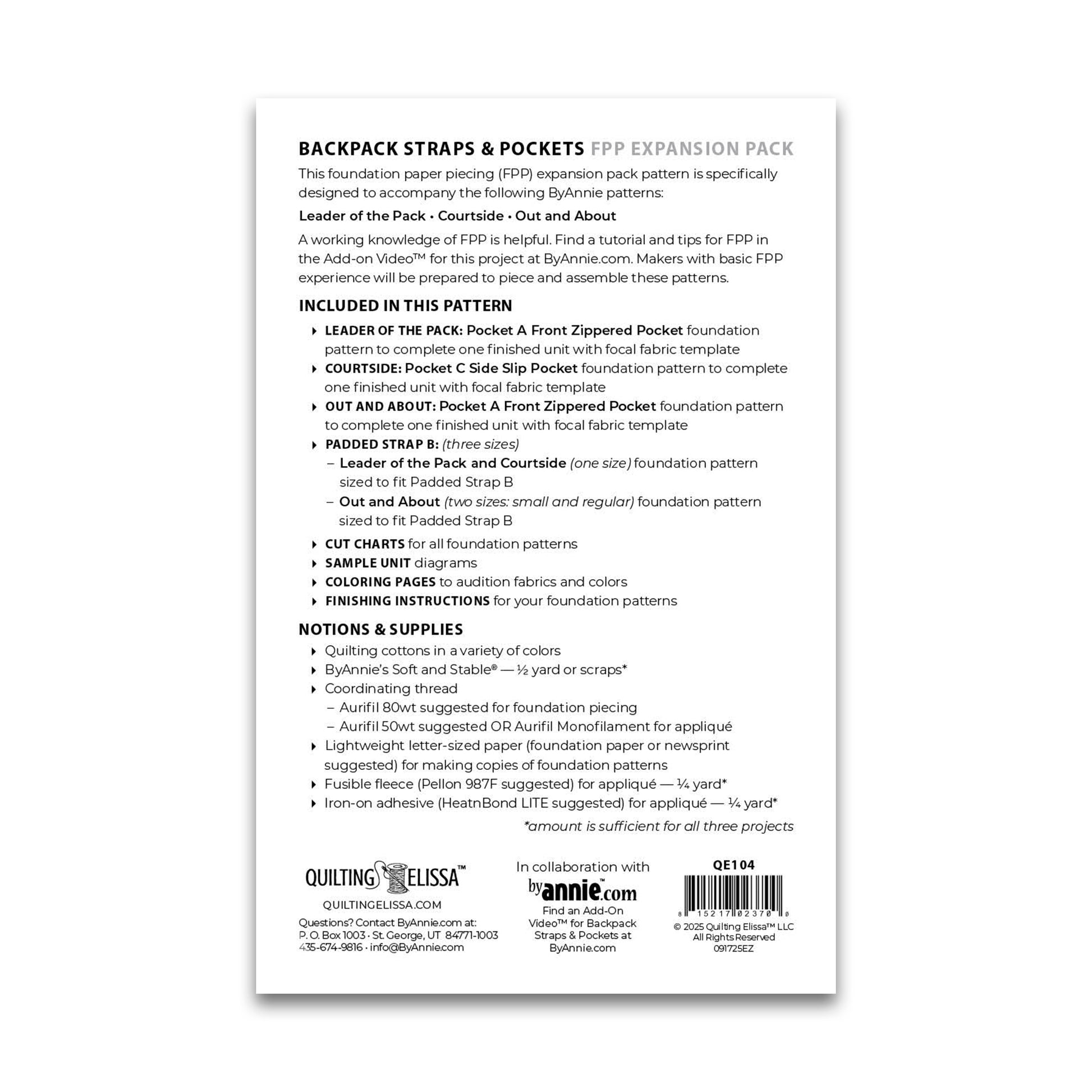 Quilting Elissa created this FPP (foundation paper piecing) Expansion Pack specifically to customize Backpack Straps and Pockets on three ByAnnie patterns (Leader of the Pack, Courtside, and Out and About).