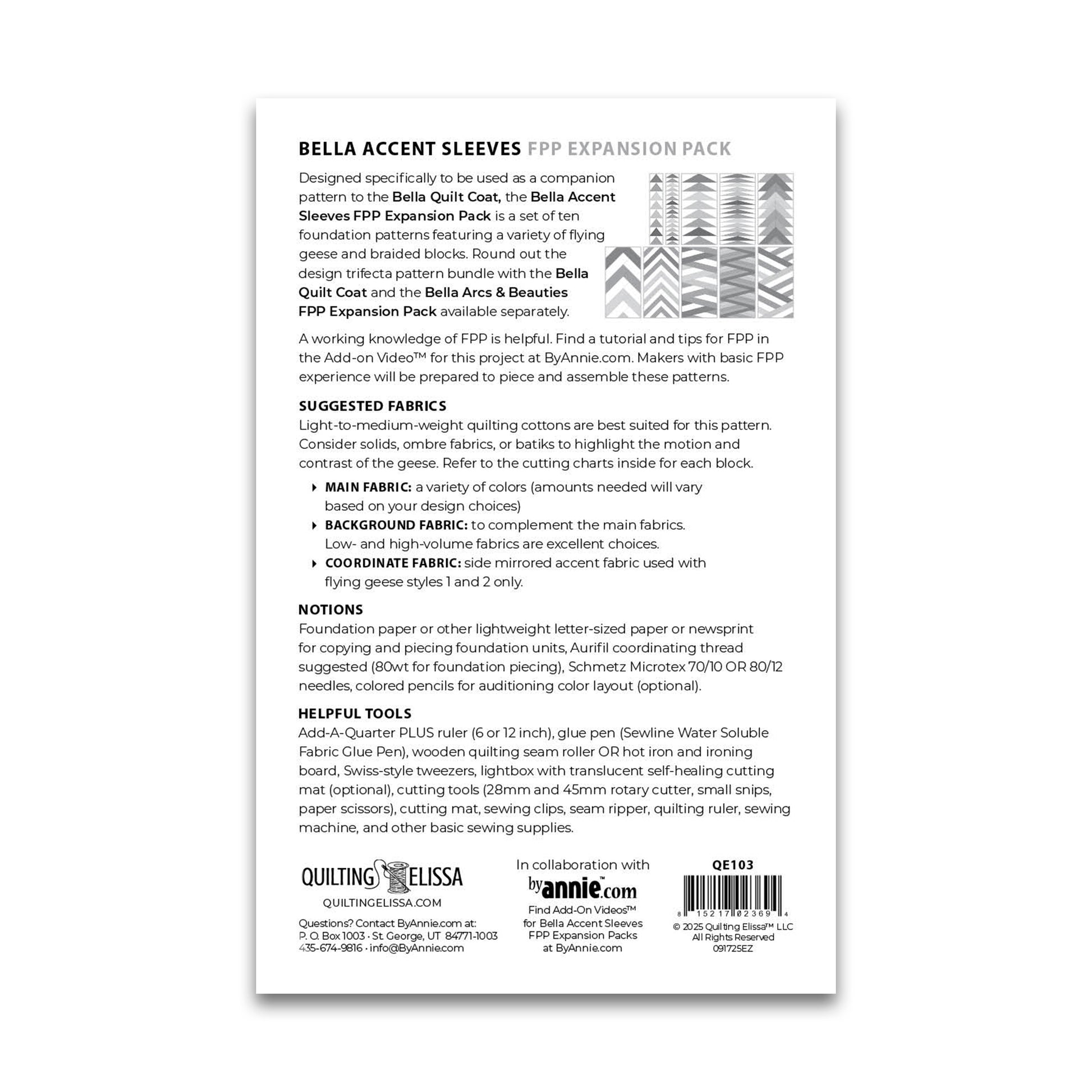 The Bella Accent Sleeves FPP (foundation paper piecing) Expansion Pack is designed specifically to be used as a companion pattern to the Bella Quilt Coat.