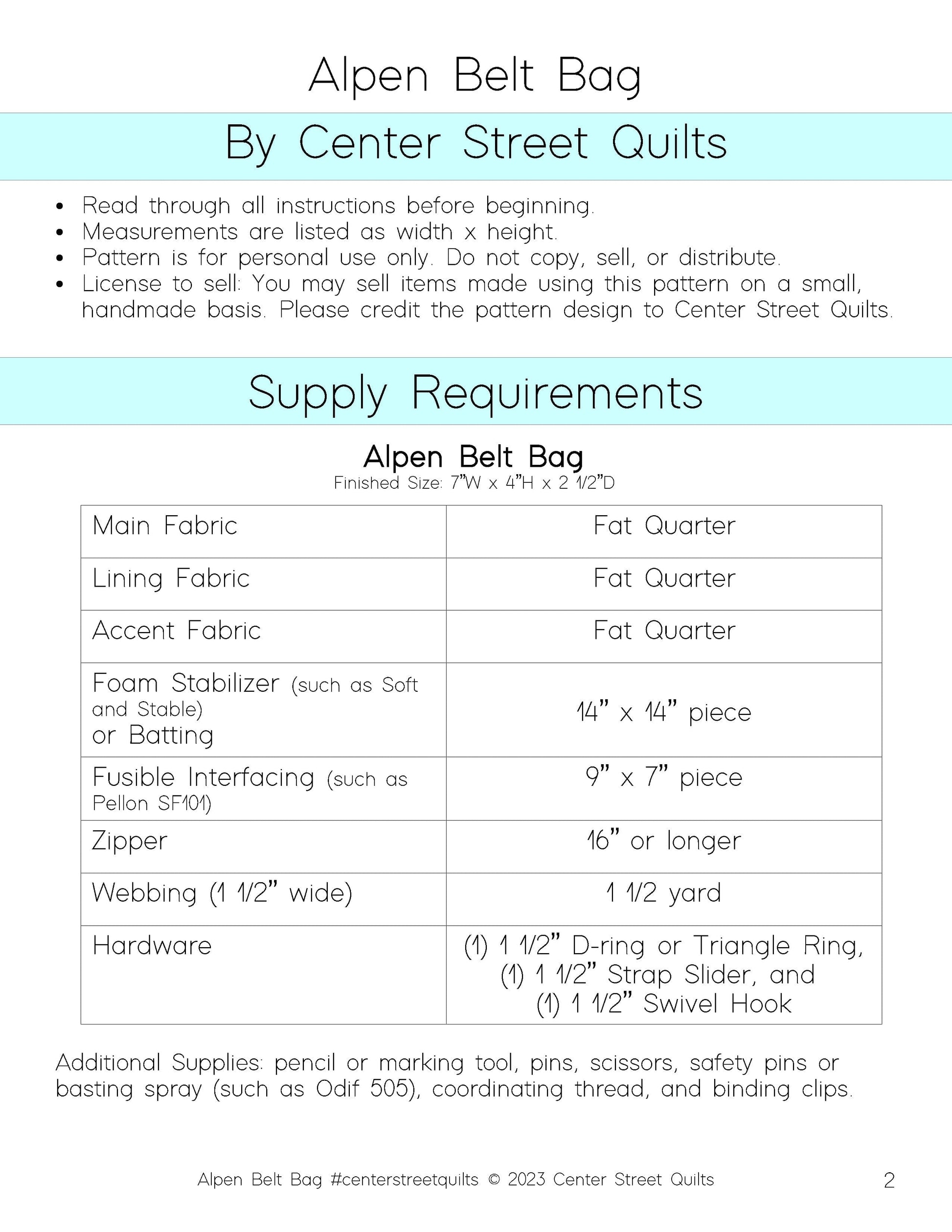 Center Street Quilts - Alpen Belt Bag Pattern - CEN103