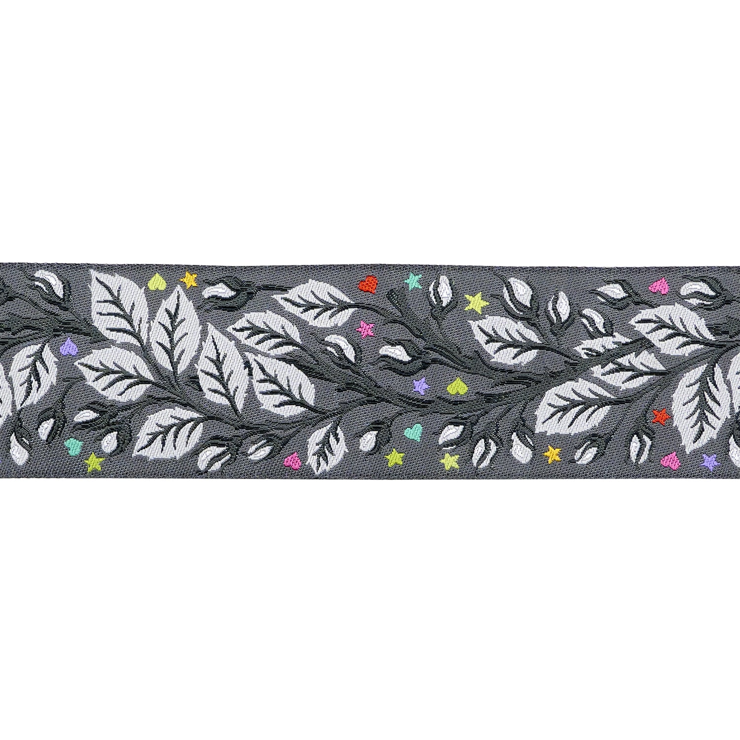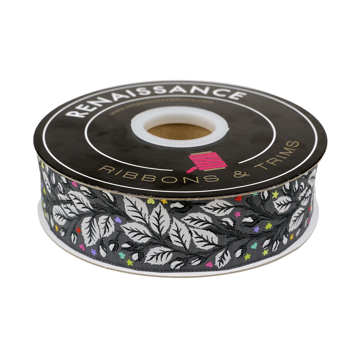 Elevate your projects with the Birthmark ribbon in Shadow—a stunning blend of elegance and whimsy. This 1-1/2 inch wide ribbon features intricately detailed gray foliage, gracefully intertwined with a sprinkle of rainbow confetti for a pop of vibrant color. The sophisticated Carbon backdrop enhances the contrast, making this ribbon a true standout.