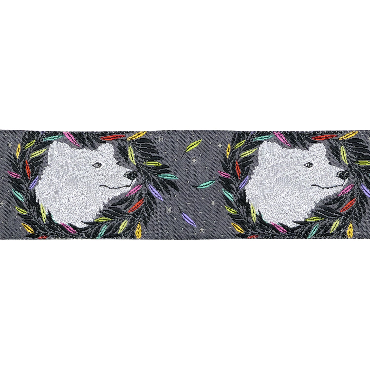 Add a touch of whimsical elegance to your projects with the Just Bearly ribbon! This 1-1/2 inch wide ribbon showcases a stunningly detailed polar bear head encircled by a vibrant rainbow wreath of leaves, all set against a playful confetti background. The intricate design and lively colors make this ribbon a delightful choice for anyone who loves bold and beautiful details.