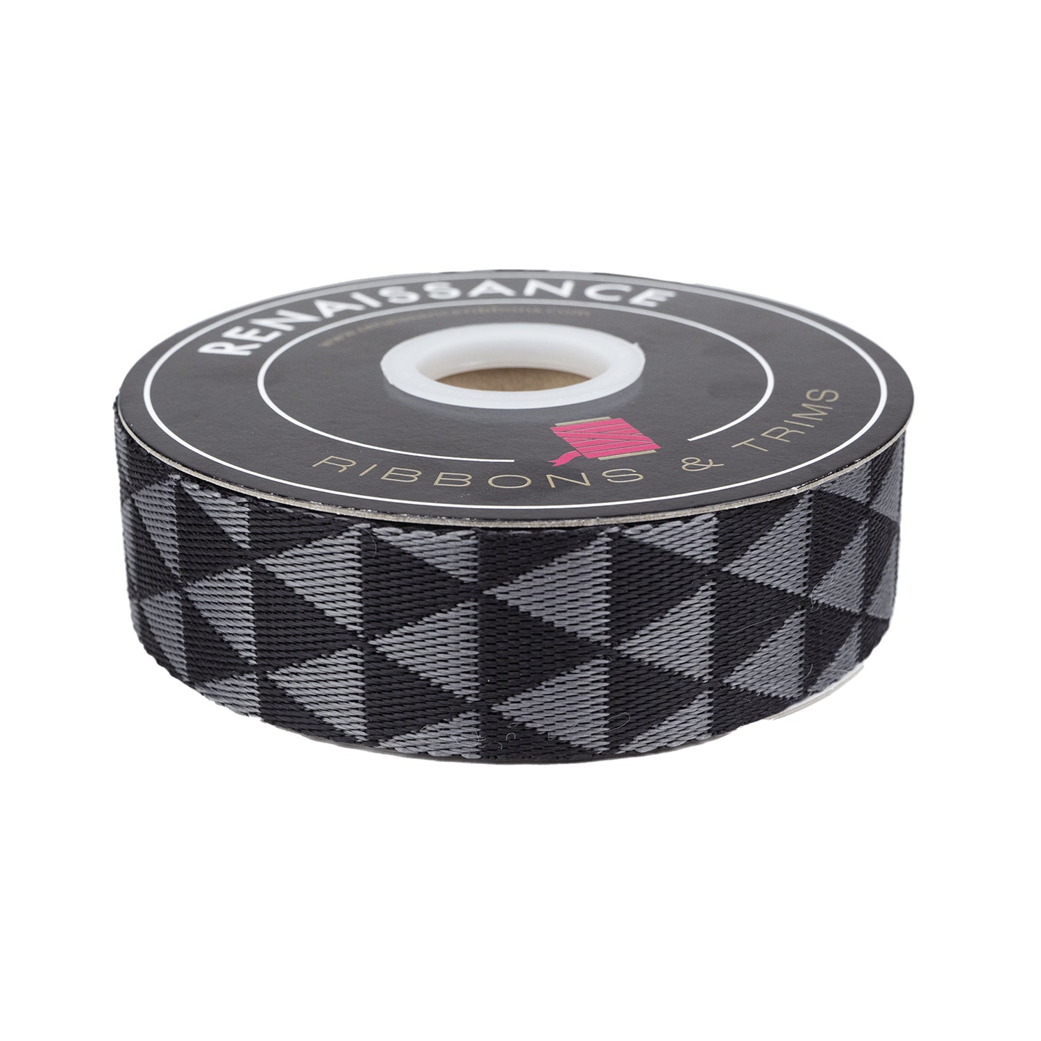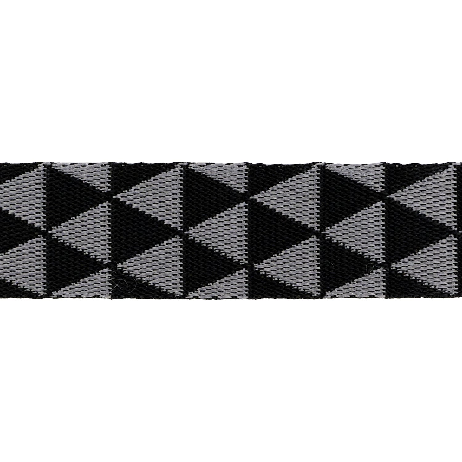 Add a touch of modern elegance to your projects with the Kinda Shady woven webbing in Carbon. This 1-1/2 inch wide webbing features stunning geometric triangles in two complementary colors, creating a sleek and sophisticated design. The soft Whisper backdrop enhances the crisp lines and subtle contrast, making this webbing a refined choice for any creation.