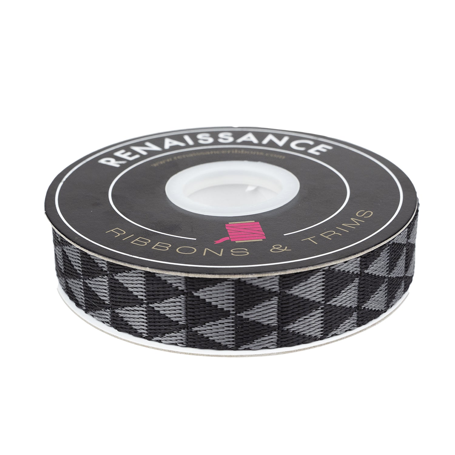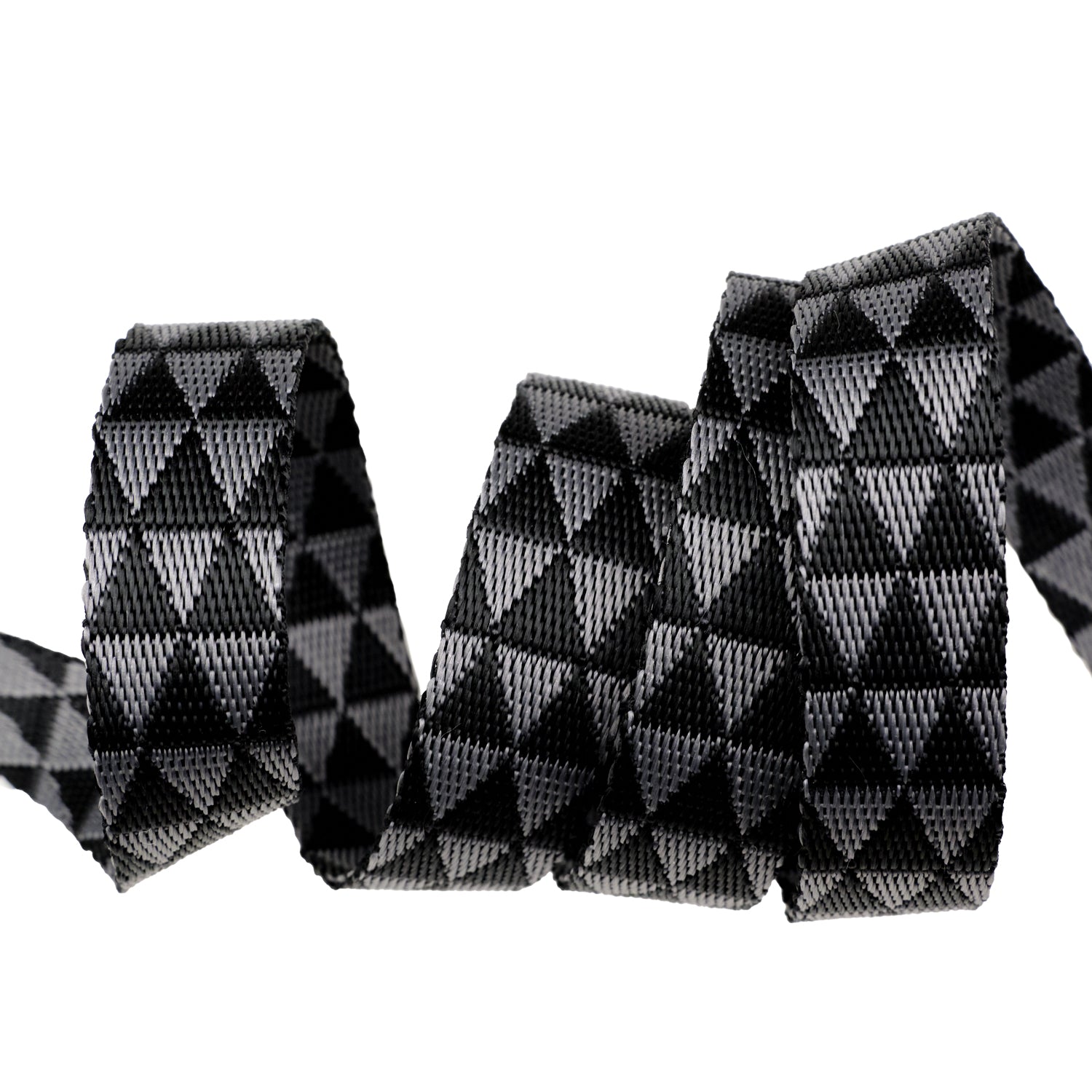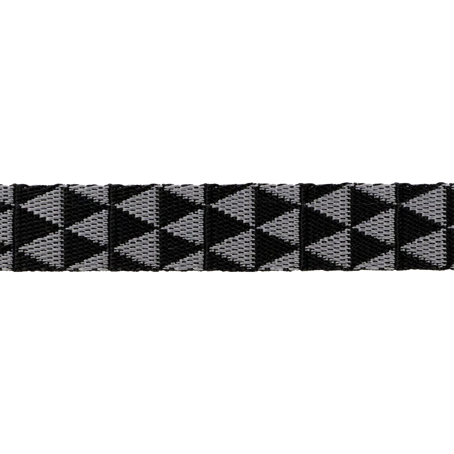 Add a touch of modern elegance to your projects with the Kinda Shady woven webbing in Carbon. This 1 inch wide webbing features stunning geometric triangles in two complementary colors, creating a sleek and sophisticated design. The rich Carbon backdrop enhances the crisp lines and subtle contrast, making this webbing a refined choice for any creation.