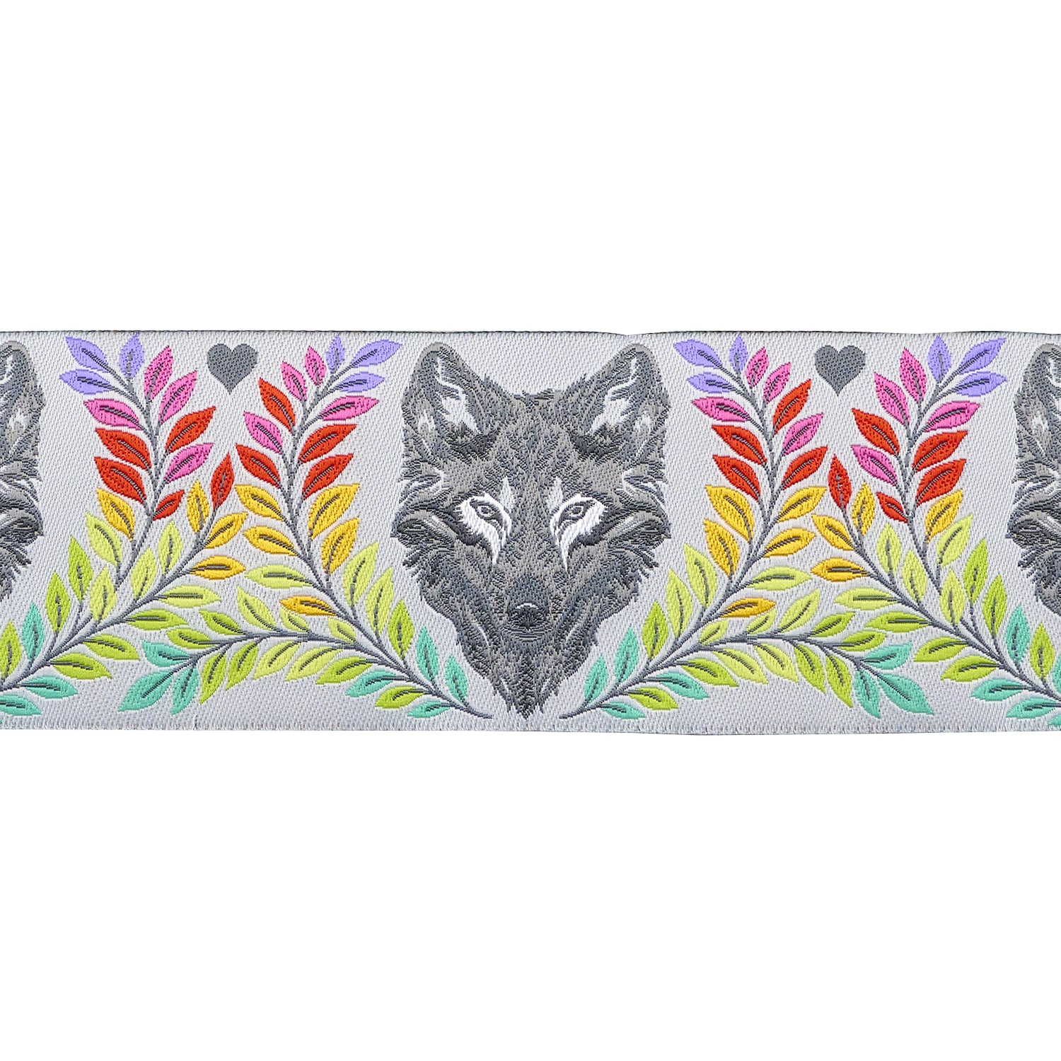 Unleash your creativity with the Wolf of Pink Street ribbon in Fog—a bold new design from Tula Pink's Graywork Collection. This 2-inch wide ribbon features majestic wolf heads surrounded by a vibrant rainbow array of leaves, all set against a deep Carbon backdrop. The striking contrast of monochrome and vivid hues makes this ribbon a showstopper for any project.