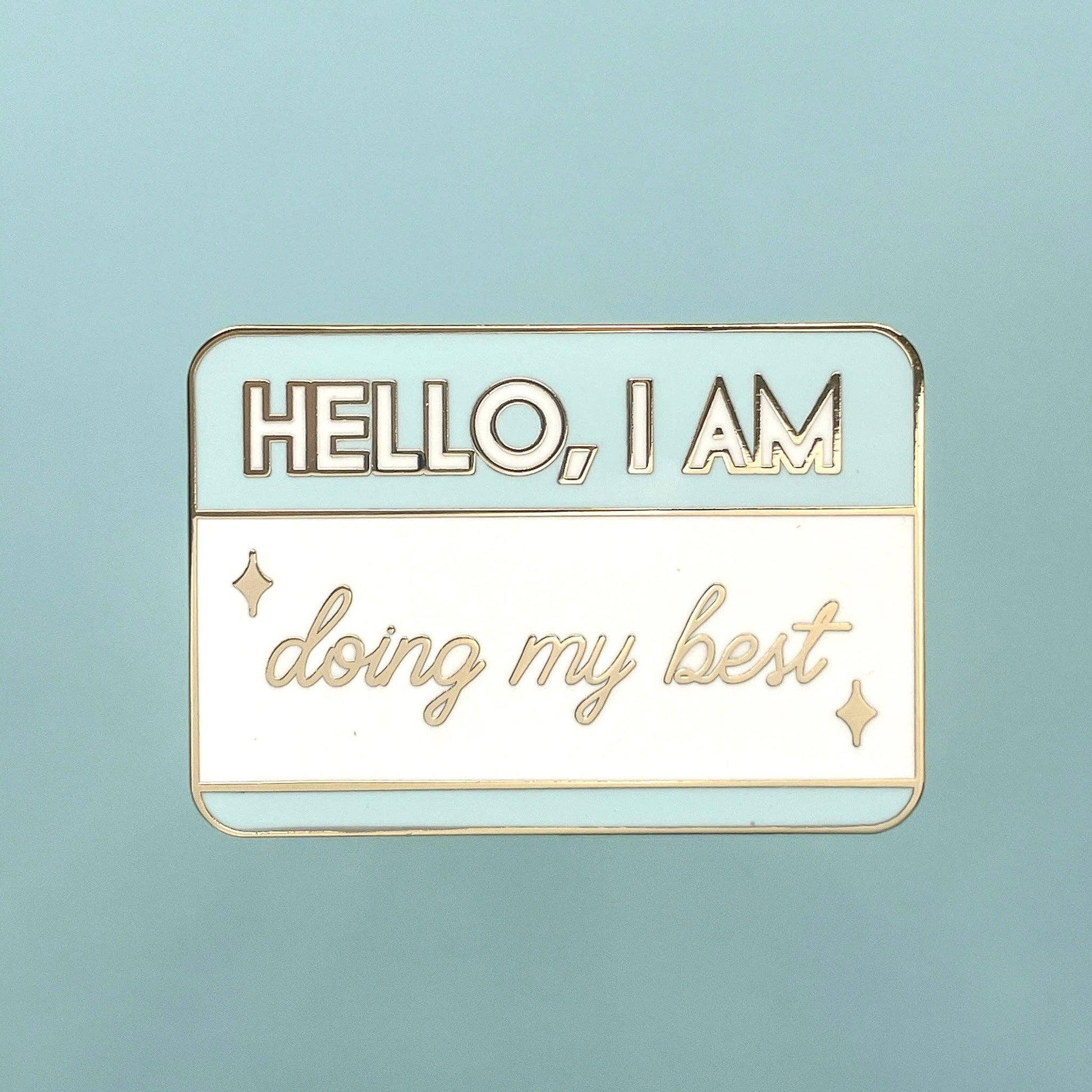 An enamel pin featuring the classic name tag to say hello, I am doing my best.
