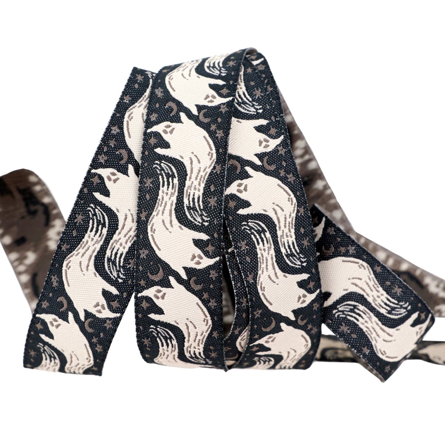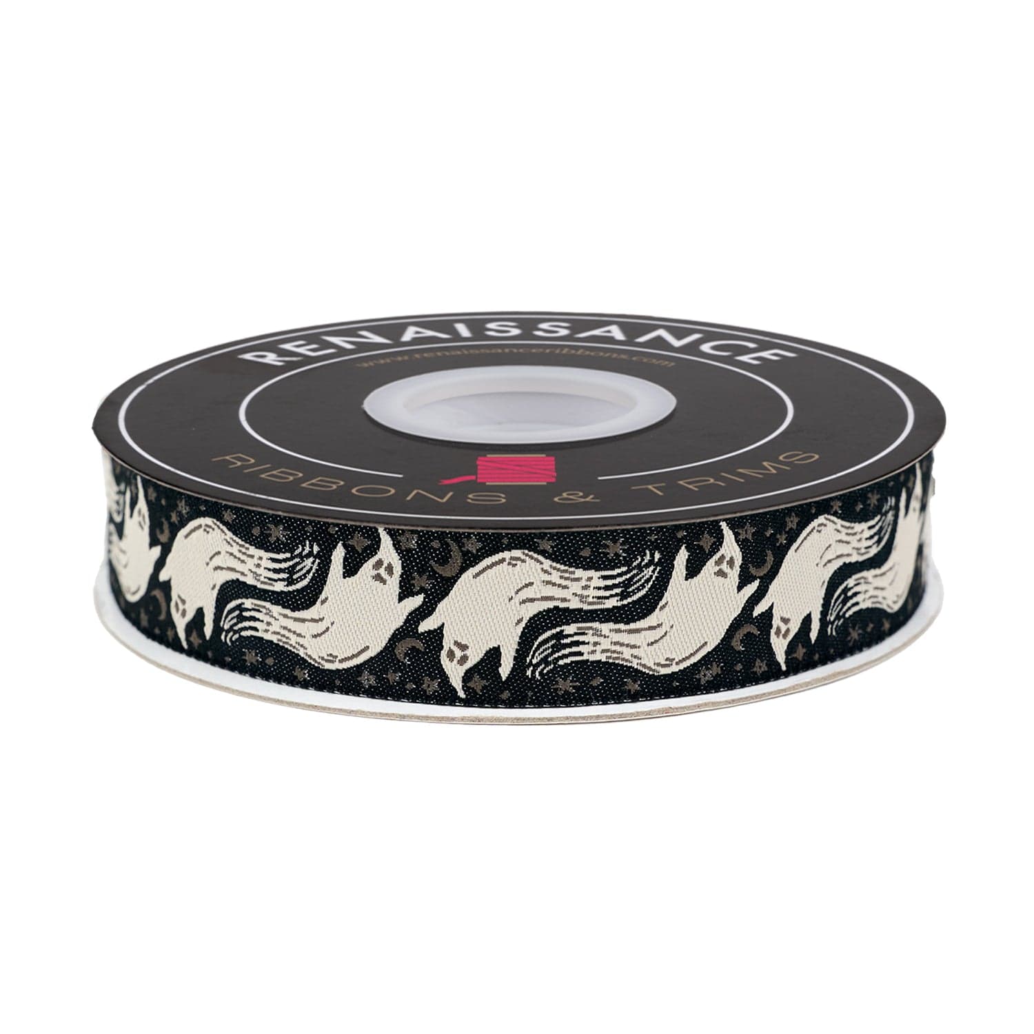 Add a playful yet spooky touch to your Halloween projects with the Boo in Charcoal ribbon from Stacy Iest Hsu’s Home Sweet Haunt collection. This 7/8" wide ribbon showcases creamy, whimsical ghosts floating across a deep charcoal background, creating a perfect balance of eerie and cute. Ideal for enhancing wreaths, gift wrapping, or any Halloween craft, this ribbon brings a subtle yet festive flair to your seasonal decor. Let these charming spirits add a hauntingly delightful detail to all your Halloween creations.