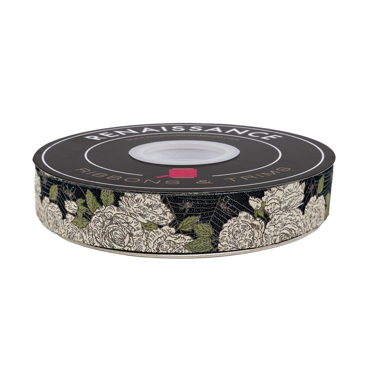 Step into a garden where eerie meets elegant with the Spooky Garden ribbon from Stacy Iest Hsu’s Home Sweet Haunt collection. This 7/8" wide ribbon features enchanting floral blooms that stand out beautifully against a charcoal background, intricately laced with delicate spider webs. The contrast between the vibrant flowers and the dark, web-covered backdrop creates a captivating blend of spooky and sophisticated. Perfect for adding a touch of haunting beauty to your Halloween crafts, this ribbon is ideal for wreaths, garlands, and any project that calls for a unique and stylish Halloween accent.