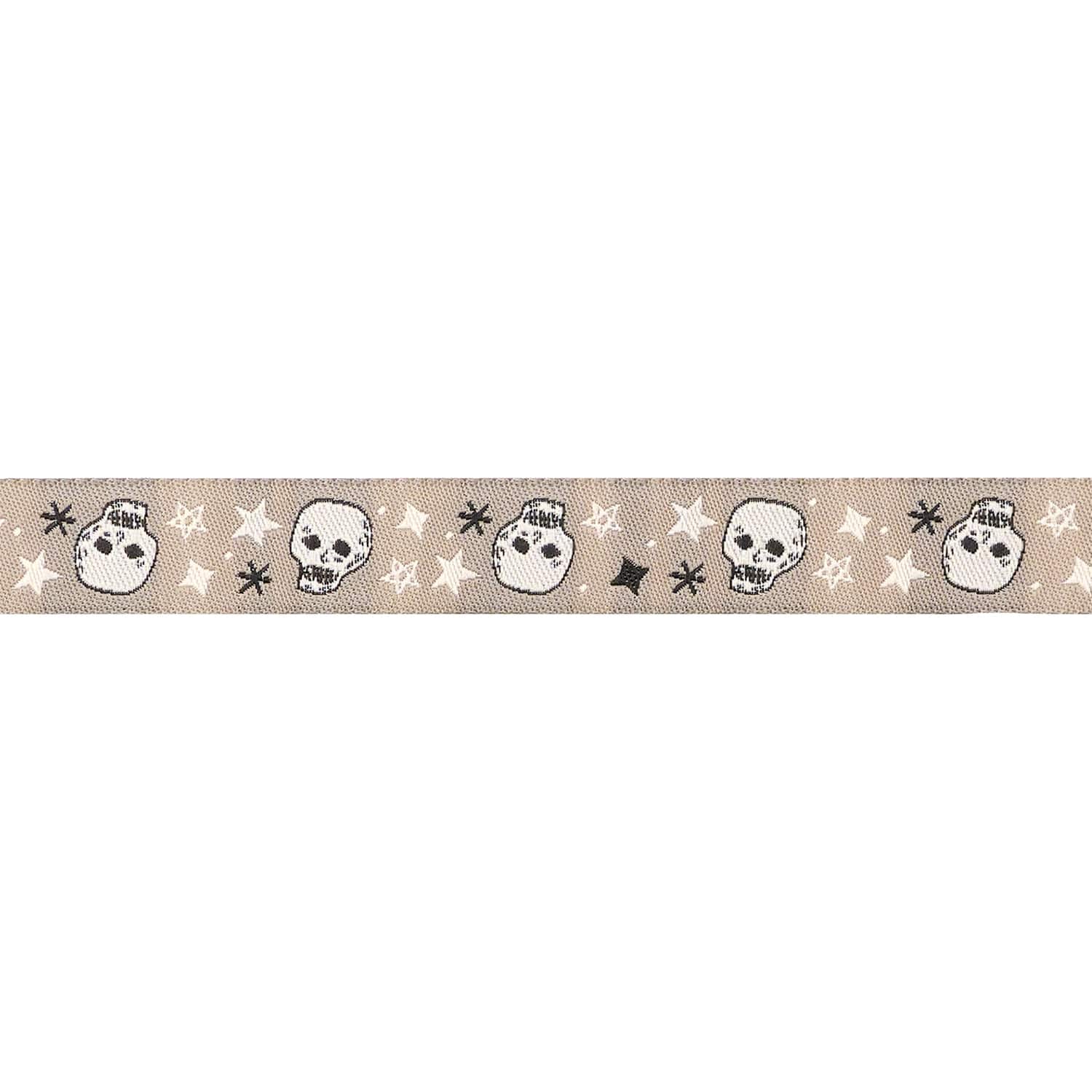 Embrace a punk-inspired Halloween vibe with the Spooky Skulls ribbon. This 5/8" wide ribbon features a dynamic design of spooky skulls paired with stars in various styles, all set against a bold charcoal background. With its edgy, Halloween-ready aesthetic, this ribbon is perfect for adding a rebellious flair to your seasonal crafts, whether you're decorating for a party, wrapping up ghoulish gifts, or creating unique Halloween decor. Let the Spooky Skulls ribbon bring a touch of punk rock attitude to your spooky celebrations!