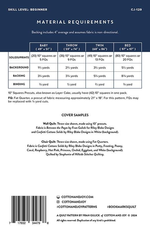 PREORDER - Bookmarks Quilt Pattern - Cotton and Joy - CJ 129 - Printed Pattern