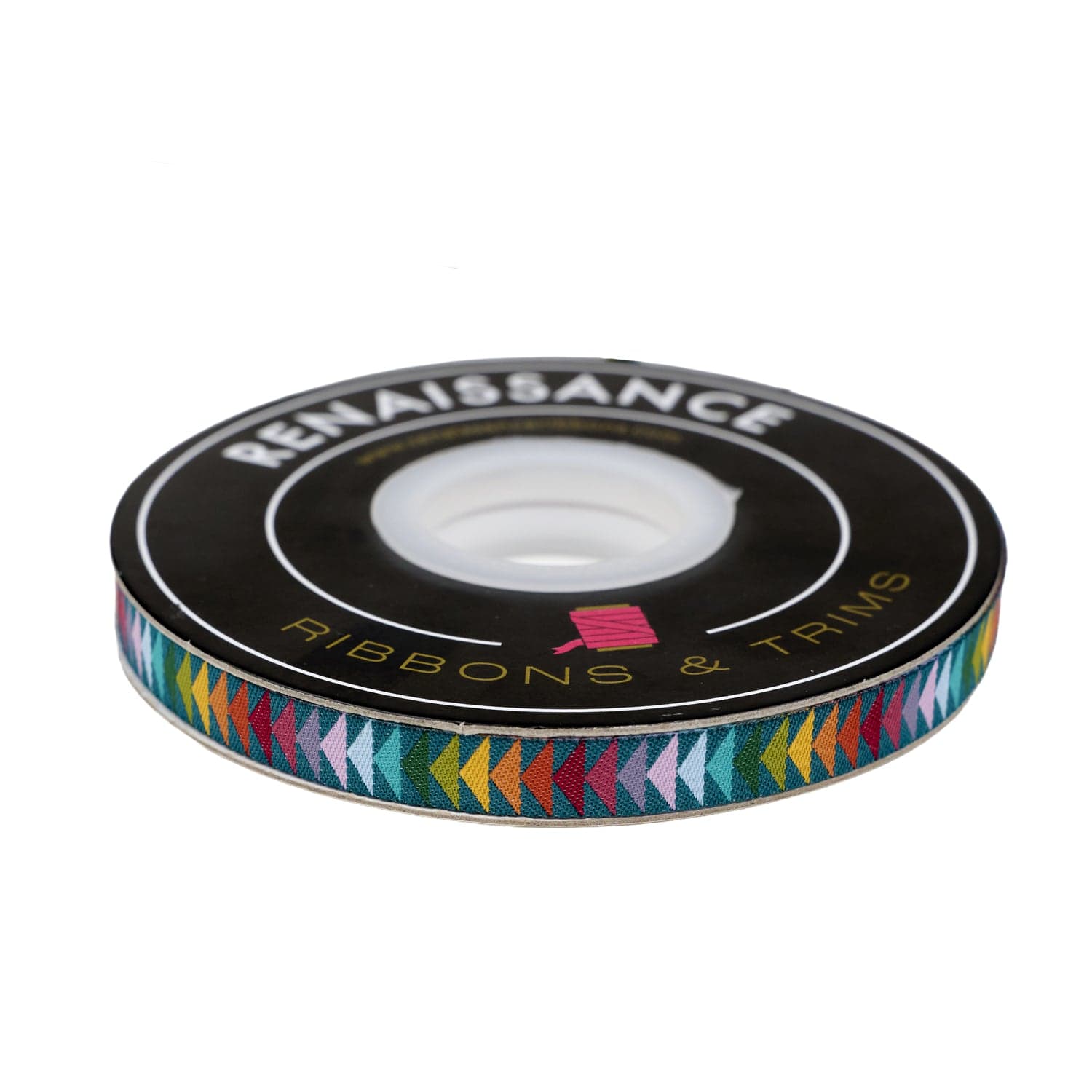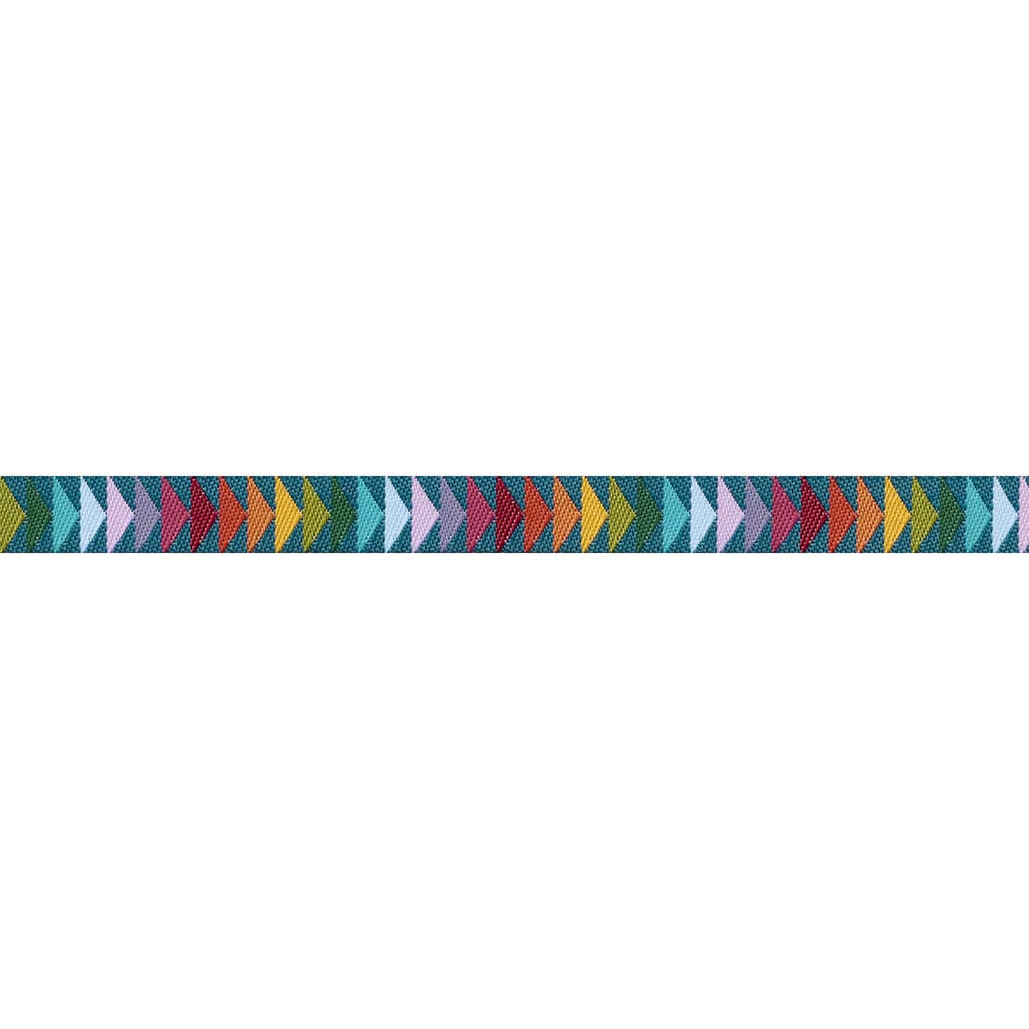 Let your creativity take flight with the Flying Geese ribbon! This 3/8-inch wide ribbon features a striking row of flying geese in a vibrant rainbow of colors, soaring across a rich, moody teal background. The contrast between the deep backdrop and the bright geometric design creates a dynamic and eye-catching effect.