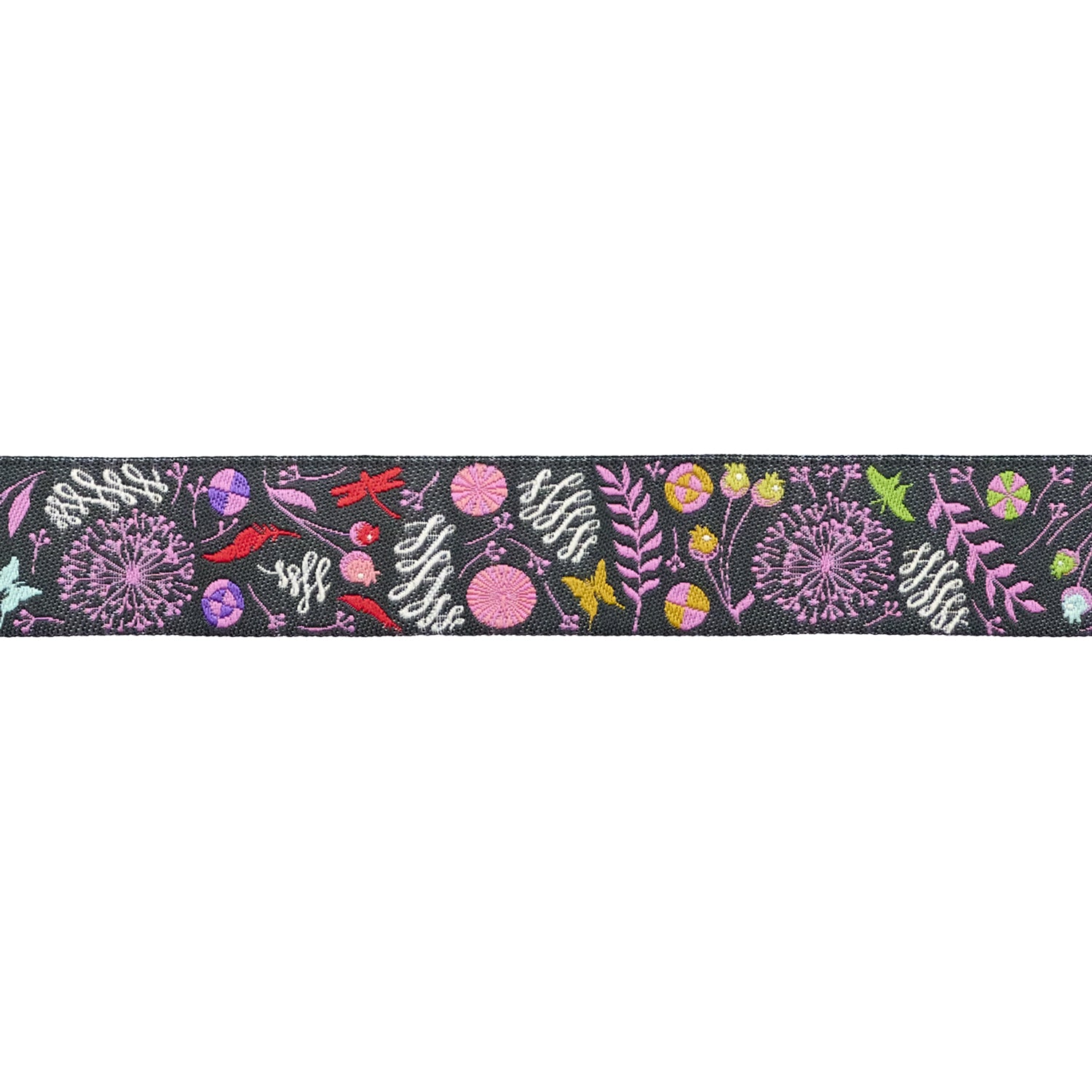 Displays the beloved Dandelion print in crisp detail against a dark charcoal background. Sophisticated yet playful, this ribbon offers a modern contrast that pairs beautifully with bold or neutral projects alike.