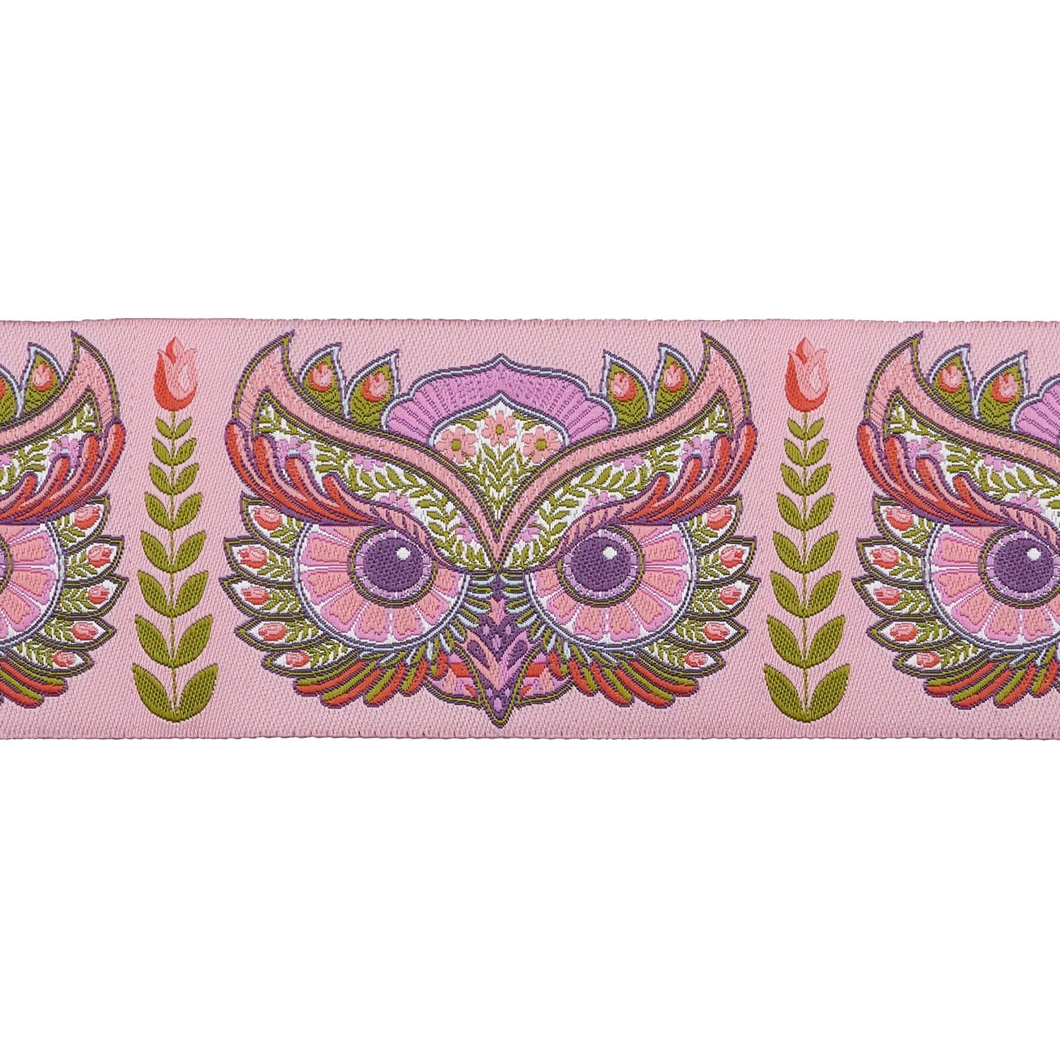 Discover the enchantment of Tula Pink’s Full Moon Forest II with this stunning 2" wide Jacquard Woven Ribbon, exclusively from FreeSpirit Fabrics. Featuring a vibrant pink background, this ribbon is adorned with intricately detailed, ornate owls that capture the essence of whimsical woodland creatures.