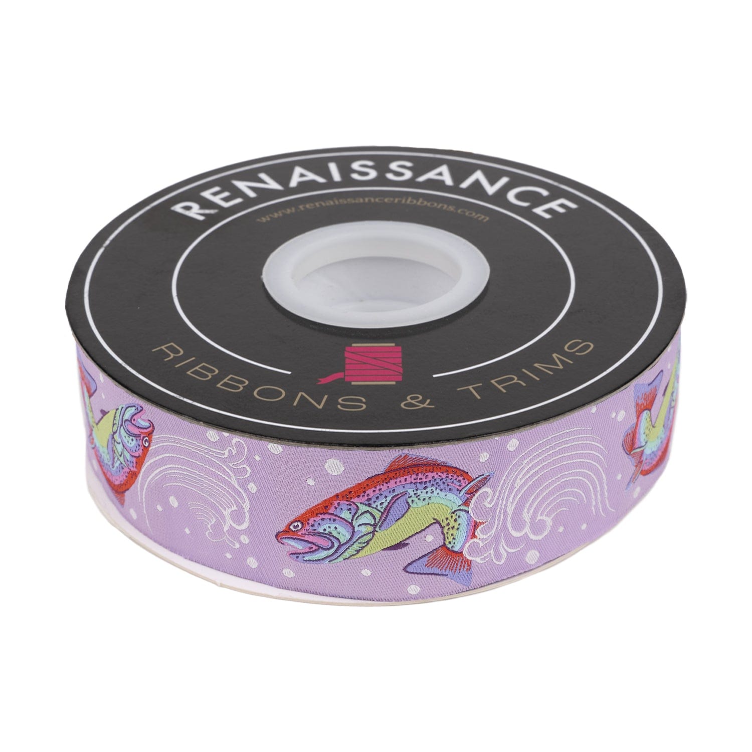 Introducing the “Sofishticated” jacquard woven ribbon from Tula Pink's Full Moon Forest II collection by FreeSpirit Fabrics. Measuring 1-1/2" wide, this ribbon features a rich purple background adorned with vibrant rainbow trout. The clever name perfectly captures the playful yet elegant essence of this design.