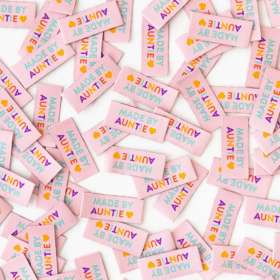 Made by auntie! Finish all your baby, kids, and quilt projects with these adorable woven labels. High quality, blush pink woven labels feature teal, purple, orange and yellow text. They are soft to the touch and never scratchy. The labels are fully washable and can handle the heat of the dryer.