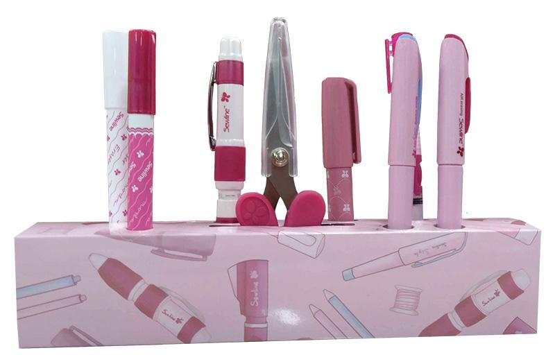 KIT INCLUDES: New Combi Marker & Eraser, Fabric Mechanical Pencil Trio, 5" Snippet Scissors, Glue Stick, Aqua Eraser, Styla Water Erasable Roller Pen, and Air Erasable Roller Pen.