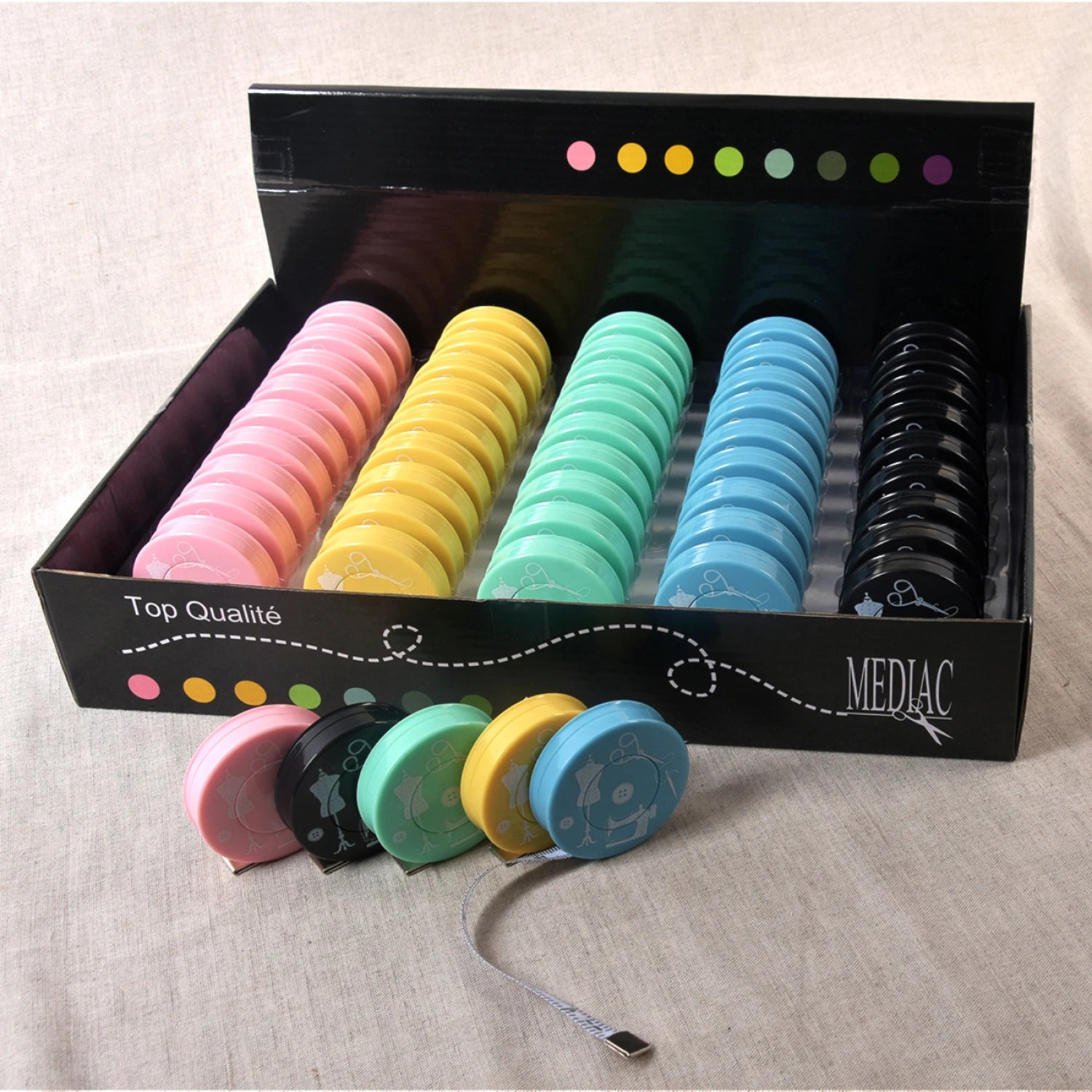 Retractable tape measure assortments. Measures in inches and centimeters. Colors include Pink, Mint Green, Light Blue, Yellow, and Black