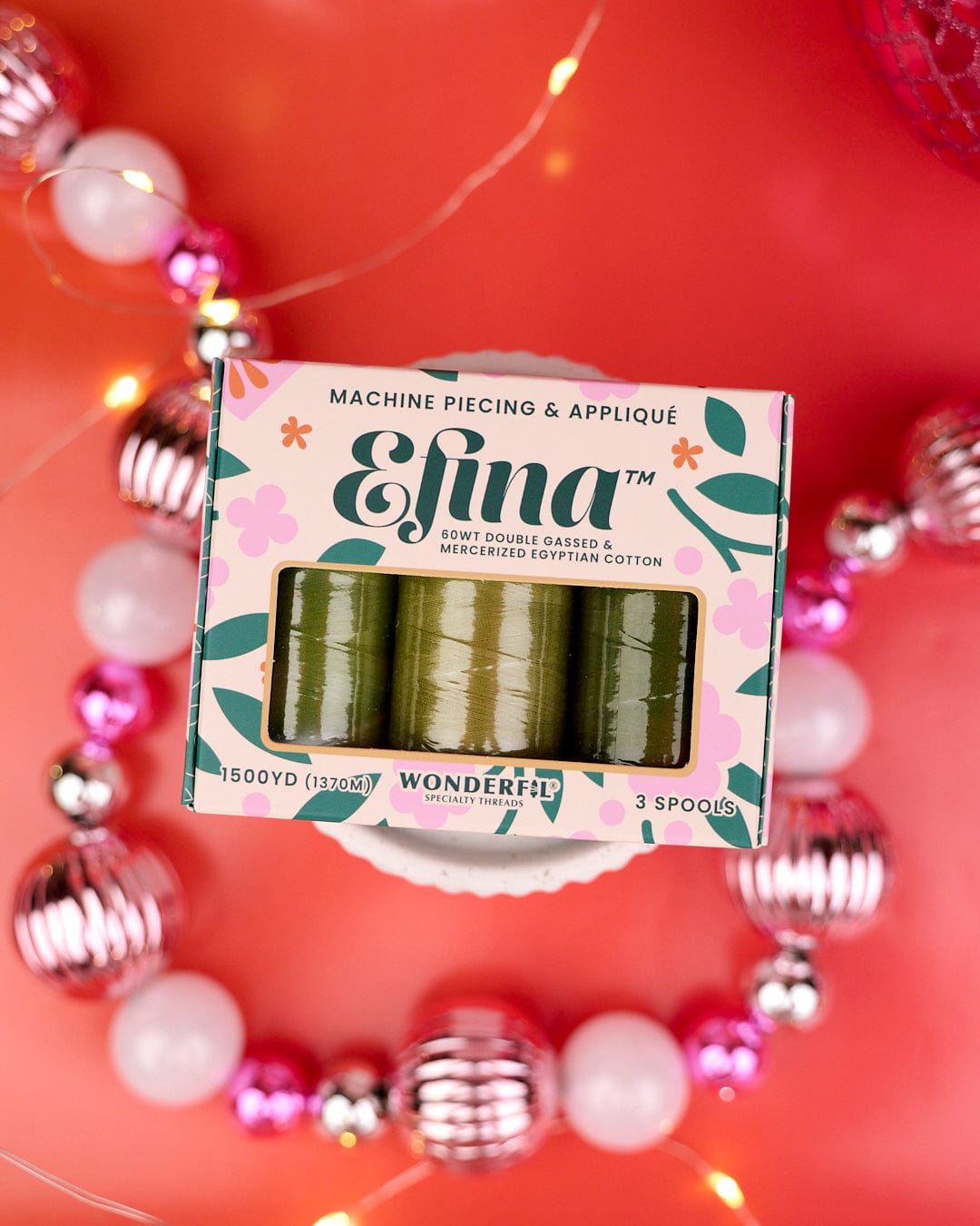 Efina™ is a 60wt, 2-ply hand applique thread made from premium Giza Egyptian cotton. Known for its softness, strength, and luster, it’s ideal for appliqué.